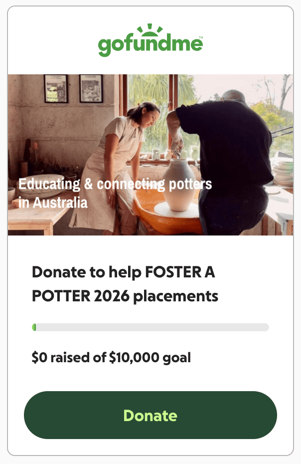 Please join FOSTER A POTTER in supporting a ceramics student to work alongside an experienced mentor in their ceramics studio. We have already raised $10,000 for one placement in 2026. Now we are aiming to raise another $10,000 to support a second student to benefit from this valuable, hands-on, learning opportunity.