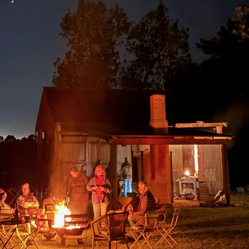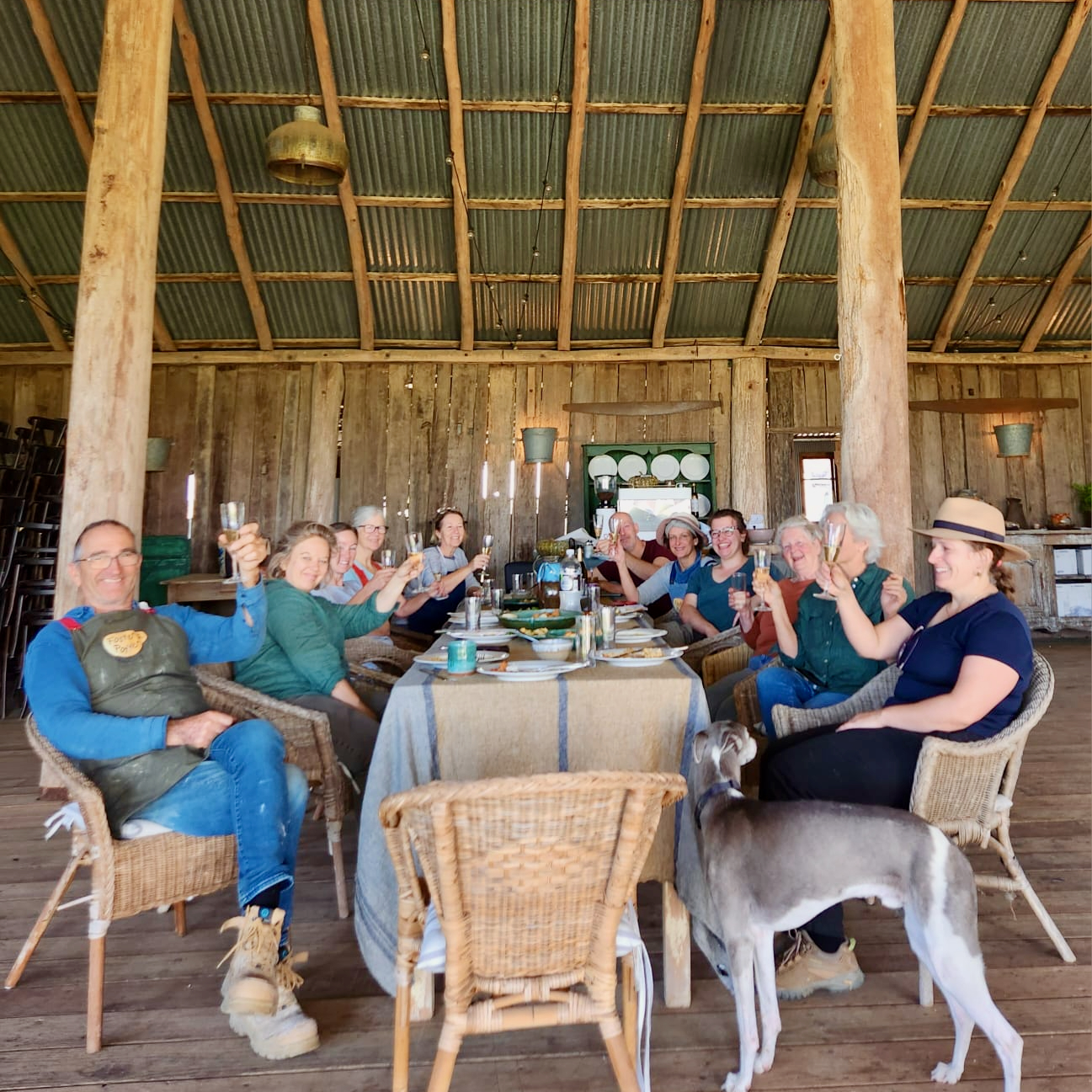 Above: workshop participants enjoying a meal in the hayshed; the Denbigh property; gathering around the fire, next to the wood kiln; from Two Woodfirings with Steve Williams, April & May 2025, Denbigh